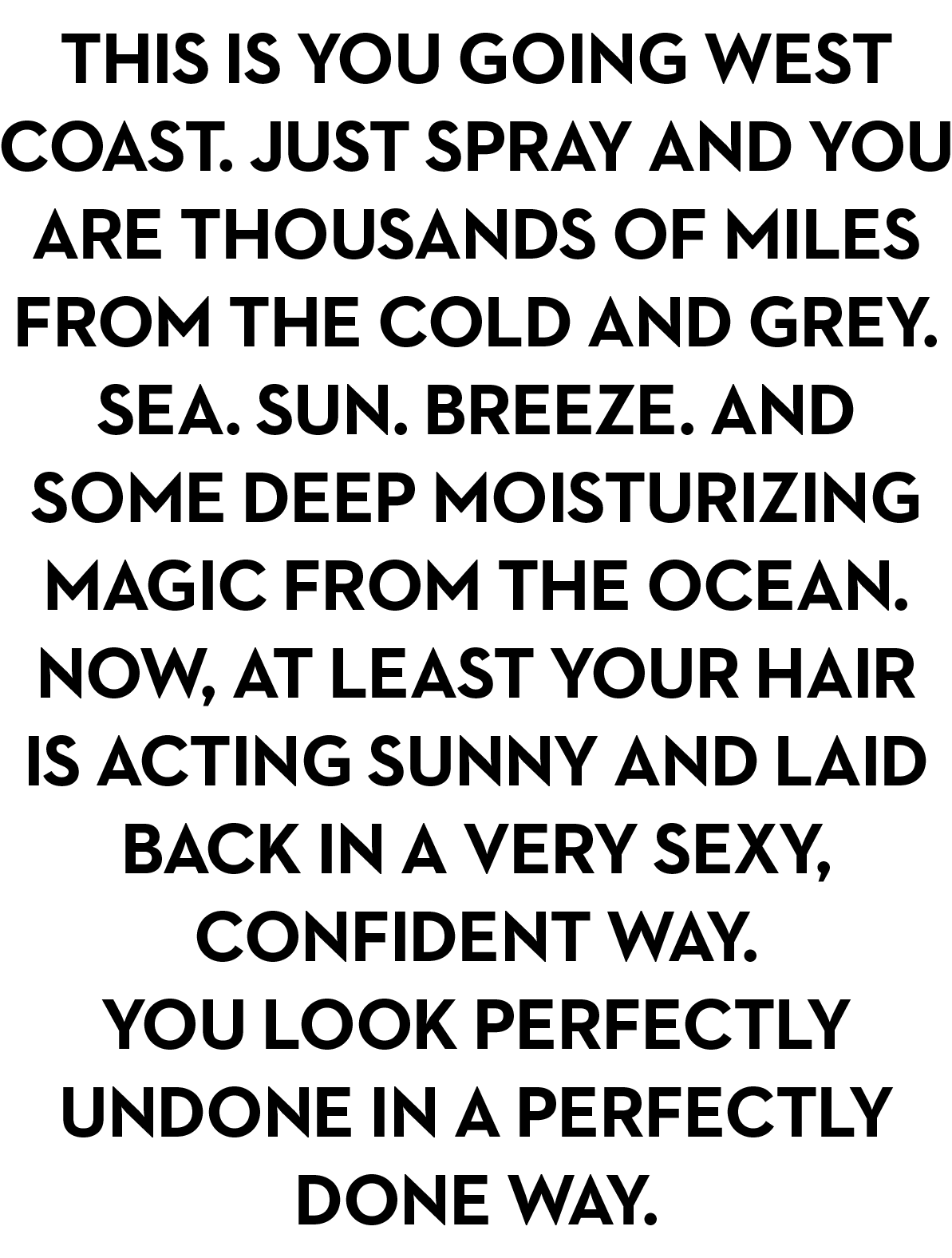 How: Spray in towel-dried hair, section by section at a distance of 20 cm mold the hair for texture and movement, air dry, or diffuse for a beachy look, for a more done undone look use a round brush.